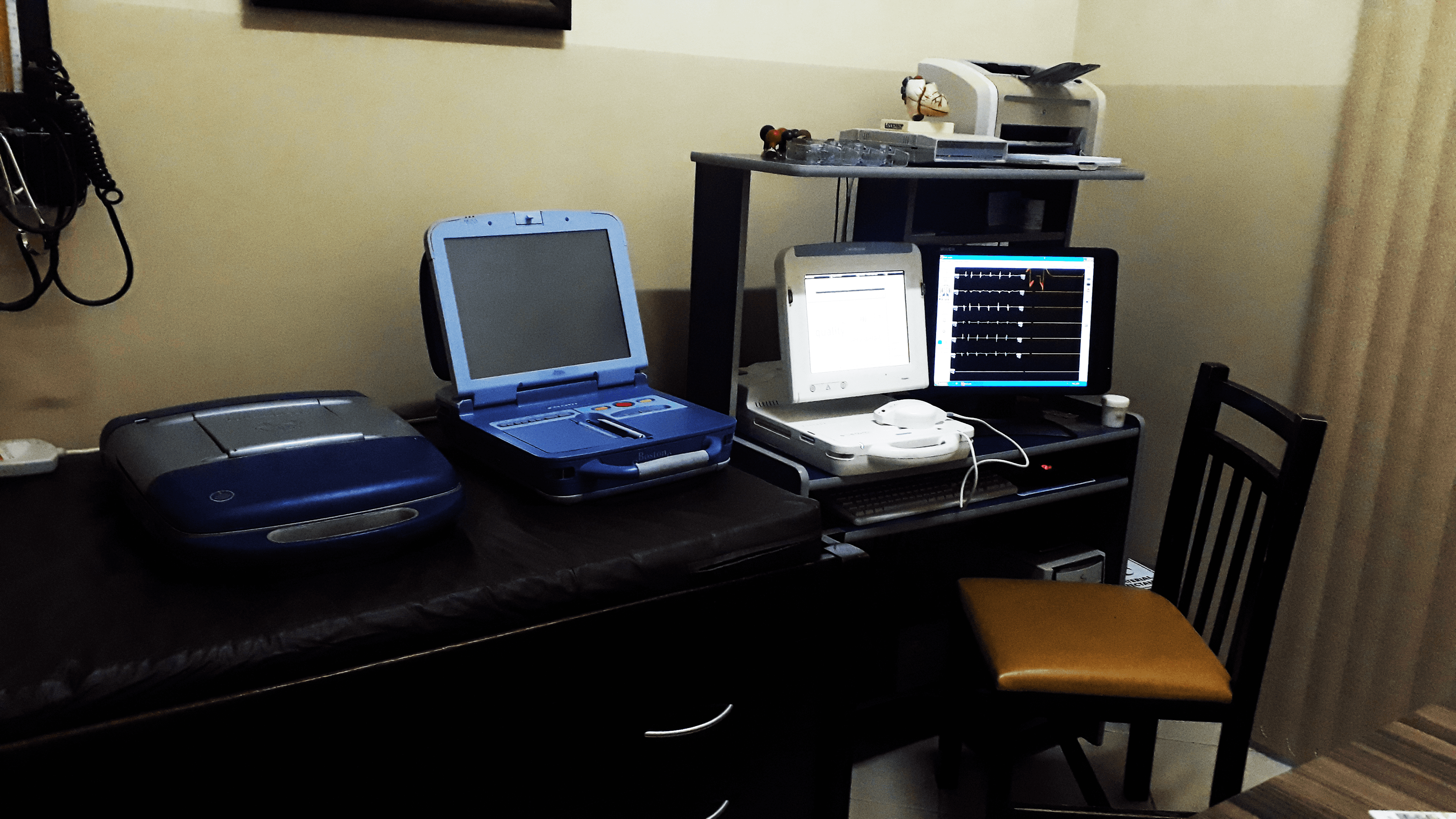 o médico move o aparelho para locais diferentes do peito ou parede